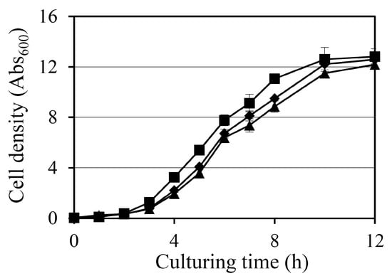 Effect of diosgenin on Staphylococcus aureus growth: growth curves of S. aureus cultures treated with ethanol (■; control) or 80 µM (◆) or 160 µM (▲) diosgenin over a 12 h period. Bacterial growth was monitored by measuring absorbance at 600 nm (Abs600). Data are presented as means ± the standard deviation of three independent experiments.