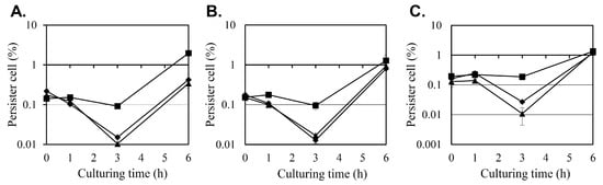 The effect of diosgenin on S. aureus persister cell formation was evaluated under antibiotic stress induced by oxacillin, ciprofloxacin, and gentamicin at 10 × minimum inhibitory concentration (MIC) (Figure 2). Persister cell survival was quantified as colony-forming units (CFU), evaluated as the percentage of surviving cells relative to the initial CFU count, with antibiotics administered 0, 1, 3, or 6 h after the diosgenin pretreatment.