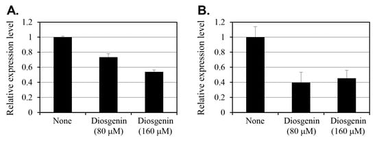 Effect of diosgenin on relP (A) and relQ (B) gene expression in Staphylococcus aureus. Staphylococcus aureus cells were treated with 80 µM and 160 µM diosgenin, and relative expression was determined using RT-PCR analysis. Gene expression levels were normalized to that of the constitutively expressed 16s rRNA gene and expressed relative to an untreated control (None). Data are presented as means ± the standard deviation of three independent experiments.