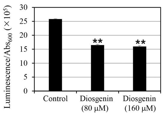 Effect of diosgenin on intracellular ATP levels in Staphylococcus aureus. Staphylococcus aureus cells were cultured in 80 µM and 160 µM diosgenin media, and ATP levels were quantified by luminescence and normalized to cell density (Abs600) to calculate intracellular ATP per cell. Data are presented as means ± the standard deviation of three independent experiments. Statistically significant differences at the 99% confidence level (p < 0.01) between the treatment means and the control mean are indicated by asterisks (“**”).