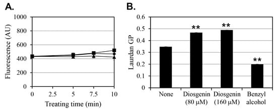 Effect of diosgenin on membrane permeability and fluidity in Staphylococcus aureus cells. (A) Membrane permeability of S. aureus cells treated with ethanol (■; control) or 80 µM (◆) or 160 µM (▲) diosgenin, as measured by fluorescence intensity (arbitrary unit, AU). (B) Membrane fluidity of S. aureus cultures treated with 80 µM or 160 µM diosgenin and untreated control cultures (none). Benzyl alcohol was used as a positive control for membrane fluidization. Data are presented as means ± the standard deviation of three independent experiments. Statistically significant differences at the 99% confidence level (p < 0.01) between the treatment means and the control mean are indicated by asterisks (“**”).