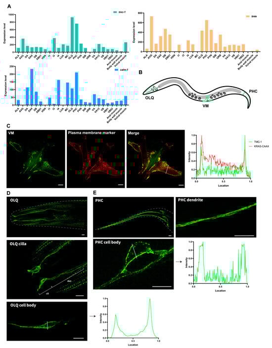 Intense plasma membrane localization of TMC-1 in C. elegans neurons and muscle cells. (A) Expression profiles of tmc-1, calm-1, and tmie (Y39A1C.1) in neuronal and non-neuronal cells of C. elegans. Data were obtained from the CeNGEN scRNA-seq dataset. (B) Diagram of anatomy location of OLQ, PHC, and VM in C. elegans. (C) Representative super-resolution fluorescence images of endogenous TMC-1 in C. elegans VM cells co-expressing the red fluorescently labeled plasma membrane marker, mCherry::KRAS-CAAX motif. (D) Representative super-resolution fluorescence images of endogenous TMC-1 in cell bodies and cilia of OLQ neurons. (E) Representative super-resolution fluorescence images of endogenous TMC-1 in cell bodies and dendrites of PHC neurons. Fluorescence intensity histograms for the corresponding images are shown on the right panels. Scale bars, 5 μm.
