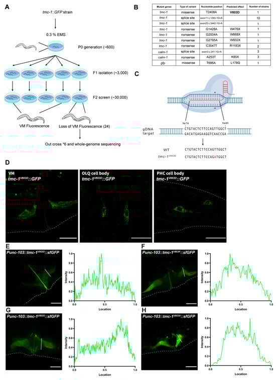 To elucidate the molecular mechanisms underlying TMC-1 plasma membrane localization, we performed a forward genetic screen using a tmc-1::GFP knock-in strain, focusing on GFP fluorescence in VM cells. Approximately 500 animals were mutagenized, and ~30,000 F2 progeny were screened, resulting in the identification of 24 mutants with reduced or absent GFP fluorescence (Figure 2A). Whole-genome sequencing revealed that most of these mutants harbored splice-site or nonsense mutations in either tmc-1 or calm-1, leading to loss of TMC-1::GFP signal (Figure 2B). Identifying calm-1 mutations therefore corroborates our earlier finding that CALM-1 is required for both TMC-1 expression and protein stability, and mirrors recent work showing that mammalian CIB2 governs the delivery of TMC1 and TMC2 to stereocilia in cochlear hair cells [8,26].