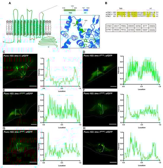 Among the identified mutations, the missense mutation TMC-1V803D, which substitutes a valine with aspartate in the ninth transmembrane domain (TM9) of TMC-1, was particularly intriguing. We introduced this mutation into the parental tmc-1::GFP strain using CRISPR/Cas9 genome editing and confirmed the phenotype (Figure 2C). The TMC-1V803D protein exhibited reduced expression and was retained in the cytoplasm across all examined cell types, including VM, OLQ, and PHC neurons, suggesting that this mutation disrupts TMC-1 biogenesis or trafficking (Figure 2D).