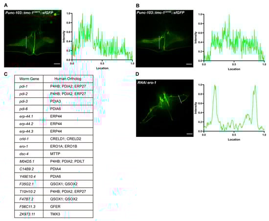 Mutations disrupting the disulfide bond impair TMC-1 trafficking. (A,B) Representative fluorescence images for VM cells overexpressing ceTMC-1C667S (A) and ceTMC-1C816S (B) mutants. Fluorescence intensity histograms for the corresponding images are shown on the right panels. (C) A list of all 18 genes screened in RNAi experiments. (D) Representative fluorescence images of VM cells in the tmc-1::GFP strain following RNAi feeding. The example shown is the knockdown of ero-1. Scale bars, 5 μm.