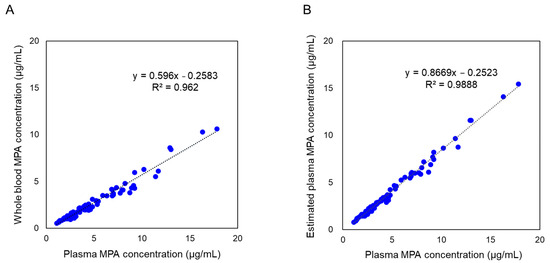 A total of 72 whole-blood samples from 20 patients who underwent renal transplantation were analyzed for estimation of MPA concentrations using a plasma reagent kit. Before hematocrit correction, a correlation between whole-blood and plasma concentrations was observed. However, values differed systematically owing to inherent differences in measurement matrices. The plasma concentration of MPA was lower in whole blood than in plasma (Figure 1A). After applying hematocrit correction, regression analysis yielded the equation y = 0.8669x − 0.2523, demonstrating strong agreement between estimated plasma concentrations and reference clinical laboratory values (Figure 1B). The coefficient of determination (R2 = 0.9888) confirmed a high degree of correlation, demonstrating the robustness of this hematocrit correction method for estimating plasma-equivalent MPA concentrations from whole blood samples.