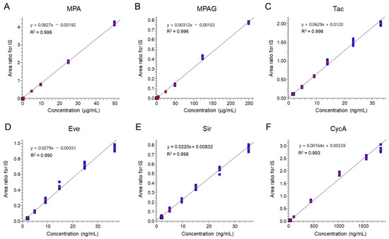 Calibration curves of individual targets. Standard calibration curves of (A) MPA, (B) MPAG, (C) Tac, (D) Eve, (E) Sir, and (F) CycA for the analytical method reported here. Each calibration curve was obtained with the standard concentration in the calibrator that appeared in accordance with the protocol. Values of y- and x-axes were calculated using the internal standard (IS) method with an IS for each immunosuppressant. Red circles represent the average area ratio for IS at each level, and blue squares represent the individual area ratio for IS at each level (n = 6).