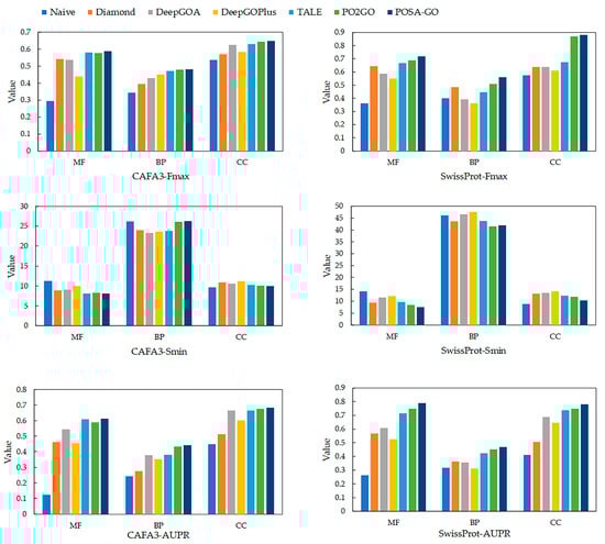 Here, POSA-GO is compared with six methods: the label transfer method Naive [30] based on sequence similarity, the homology function prediction Diamond [7] based on homology, the graph convolutional neural network (GCN)-based method DeepGOA [21], the deep learning and sequence comparison method DeepGOPlus [20] based on CNNs, the method based on Transformer TALE [22], and PO2GO [25], a deep-learning method based on improved partial order relations; and in our experiments we use the hyperparameters provided in the original paper.