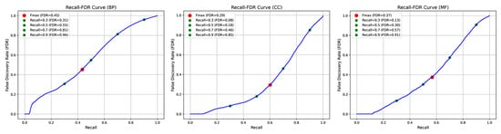 In addition, we further analyze the false discovery rate (FDR) of POSA-GO on various ontologies using the CAFA3 dataset and present the Recall–FDR curves in Figure 2 to evaluate the model’s reliability in practical applications. For the BPO model, at maximum recall (approximately 0.9), the false discovery rate reaches as high as 0.959, resulting in a significant number of false positives. In the CCO model, there is improved control of the FDR. At the Fmax threshold of 0.499, the FDR is only 0.295. Even with a high recall of approximately 0.9, the FDR remains below 0.85. In the MFO model, similar to the BPO model, the FDR sharply increases at high recall levels. However, at the optimal threshold of 0.395, the FDR is 0.374, indicating acceptable reliability when predictions are made at the Fmax point. In summary, FDR tends to rise with high recall, but a good balance between recall ability and prediction reliability can be achieved by selecting an appropriate prediction threshold.