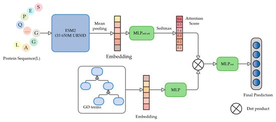 Specifically, for a given protein , its original embedding representation is obtained through the protein feature extractor ESM-2. For a given Gene Ontology (GO) term , its original embedding is obtained through the terms encoder. In order to map the embeddings of proteins and Gene Ontology (GO) terms into the same semantic space, two independent multilayer perceptron machines (MLPs) are used to perform the nonlinear transformation, respectively:
