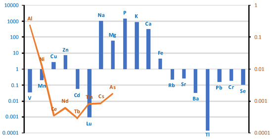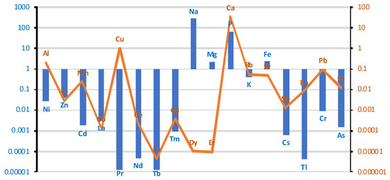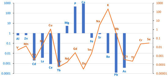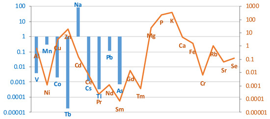 The differences in the content of individual elements in liver tissue between the group of cases (smokers) and controls (non-smokers) on a logarithmic scale are presented in the graph in Figure 5.