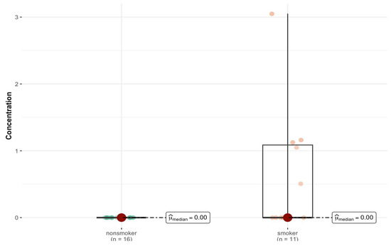 Based on the results of the Mann–Whitney test, it can be seen that, for most elements, no statistically significant differences in concentration were observed between the smoking and non-smoking groups. The exception is aluminum (Al), for which the p-value is 0.004. This indicates a significant difference at the typical level of statistical significance, e.g., 0.05 (Figure 2).