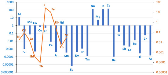 Comparison of differences in mean values of individual elements on a logarithmic scale in lung tissue (right + left) divided into case/control groups. Blue bar represents log(case mean–control mean); orange line represents log(control mean–case mean).