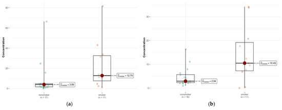 When the left and right lung tissues are considered separately, there is an asymmetric distribution of elements between the two sides of the body. A comparative analysis of the medians between the smoker/non-smoker groups (Table 2) revealed statistically significant differences for Al content in both the right (p = 0.026) and left lungs (p = 0.022) (Figure 4a,b) and for Dy in the right (p = 0.035) (Figure S1, Supplementary Materials) and left lungs (p = 0.041). Smokers have statistically significantly more of these elements. In the left lung, there were additional differences in the content of Er (p = 0.003), Nd (p = 0.018), Pr (p = 0.004), Sm (p = 0.01), Sr (p = 0.011), Mn (p = 0.047), and Na (p = 0.042) (Figure S2, Supplementary Materials).