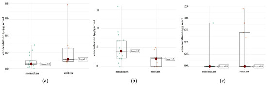 Comparison of statistically significant differences in median values of Pb (a), Cu (b), and Tl (c) content in liver tissue of smokers (n = 9) and non-smokers (n = 17).