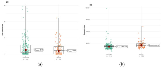 An analysis of the results of the Mann–Whitney test shows significant differences in the concentration of some elements in the brain between smokers and non-smokers (Table S2a, Supplementary Materials). In particular, a significantly lower concentration of Cu (p = 0.047) was observed in smokers compared to non-smokers (Figure 8a). Another significant result is a higher concentration of Na in smokers (p < 0.001) (Figure 8b). The median Na concentration was 1762.815 µg/g (w.w.) in non-smokers and 2065.320 µg/g (w.w.) in smokers, indicating significant differences in the concentration of this element. For the remaining elements, no statistically significant differences were found between smokers and non-smokers.