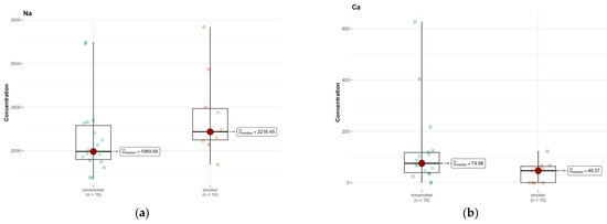 The results of the Mann–Whitney test indicate that only sodium (Na) concentration differs statistically significantly between the smokers and non-smokers (p = 0.040). Phosphorus (p) (p = 0.056) and zinc (Zn) (p = 0.065) show p values close to the significance threshold, but do not exceed it. These results should be considered as guidelines for further research. Similarly, selenium (Se) (p = 0.087), despite its role in neutralizing oxidative stress (related to smoking), did not show a significant difference, although the p value suggests a certain trend (Figure S3, Supplementary Materials).
