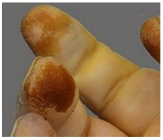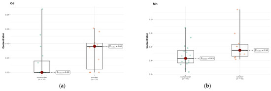 In region B, the only elements approaching significance were cadmium (Cd) and Mn (Figure 10a,b). The median is smaller than the limit of detection (DL) (0.00 µg/g; w.w.) for non-smokers and 0.018 µg/g (w.w.) for smokers, indicating a higher concentration of this element in the smokers group (Tables S1g and S2c, Supplementary Materials). The test statistics (46.500) and p-value (0.058) suggest a possible difference, but not at the significance level, after Bonferroni correction.