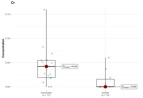 An analysis of the results of comparative tests between the group of smokers and non-smokers for individual elements in the C region does not show significant statistical differences for most of the analyzed elements (Tables S1h and S2d, Supplementary Materials). The p values, in most cases, exceed the standard significance threshold of 0.05, which suggests a lack of statistically significant differences in the median concentrations of these elements between both groups. The only element for which a significant difference was detected is chromium (Cr) (p = 0.010) (Figure 11). Its median concentration was 0.042 µg/g (w.w.) in non-smokers, while in smokers it was <DL (0 µg/g; w.w.), which indicates significantly lower values in this group. The statistical test suggests that this difference is significant and is not due to random variability in the samples.