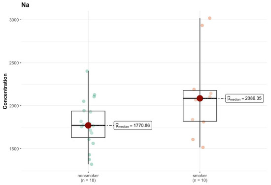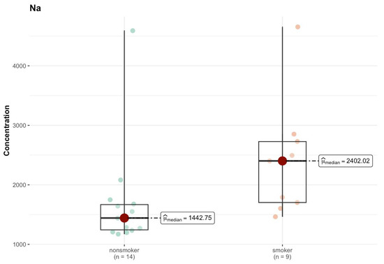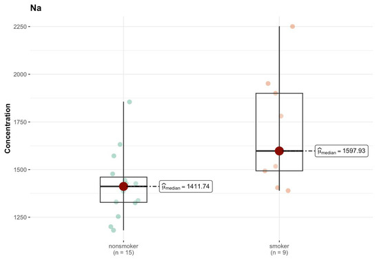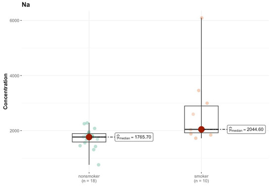 In region H, the test statistics and p values do not suggest significant differences between groups (Tables S1m and S2i, Supplementary Materials). The only element that shows a significant difference between groups is sodium (Na), where p = 0.010 indicates a statistically significant higher concentration in the smokers group (median 1597.932 µg/g; w.w.) compared to non-smokers (median 1411.739 µg/g; w.w.) (Figure 12). This may suggest some systematic difference in sodium levels between groups.