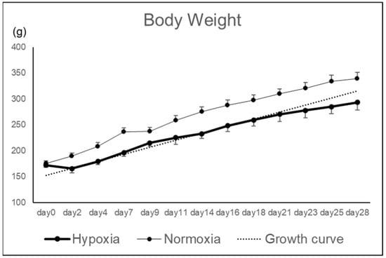 Rat knee osteochondral defect models were bred under hypoxic conditions (12%), and the effects of hypoxic conditions on the repair tissue were evaluated macroscopically and histologically. Body weight in the Hypoxia group tended to decrease until postoperative day 2, but subsequently increased along the growth curve without deviation (Figure 1).