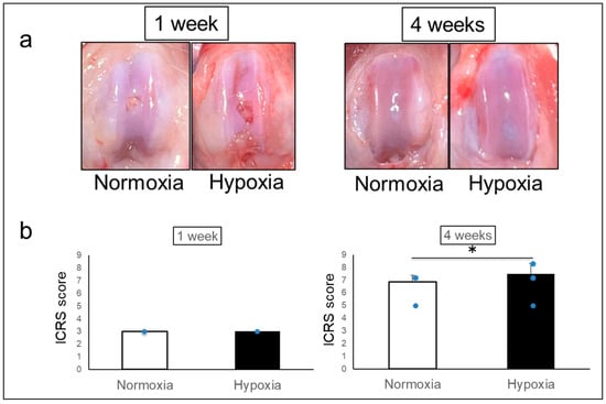 Macroscopic findings. (a) Representative photographs. (b) ICRS score (mean ± standard deviation). * p < 0.05 (1 week: Normoxia group, n = 4; Hypoxia group n = 4) (4 weeks: Normoxia group, n = 16; Hypoxia group, n = 16).
