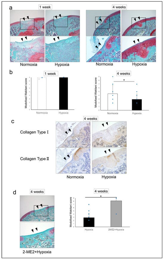 (a) Representative micrographs of Safranin O-stained sagittal sections and fragments (scale bar: upper 500 μm, lower 200 μm), (b) the Modified Wakitani score (mean ± standard deviation) (1 week: Normoxia group, n = 4; Hypoxia group n = 4. 4 weeks: Normoxia group, n = 16; Hypoxia group, n = 16), (c) micrographs of Collagen Type I and Collagen Type II immunostaining (scale bar: 200 μm), (d) representative micrographs of Safranin O-stained sagittal sections of the 2-ME2 + Hypoxia group (scale bar: upper 500 μm, lower 200 μm), the Modified Wakitani score (mean ± standard deviation) compared to the Hypoxia group (* p < 0.05) (Hypoxia group, n = 16; 2-ME2 + Hypoxia group, n = 6). ▼: the area of the osteochondral defect. Black boxes in the 40× images indicate the regions shown at higher magnification (100×).