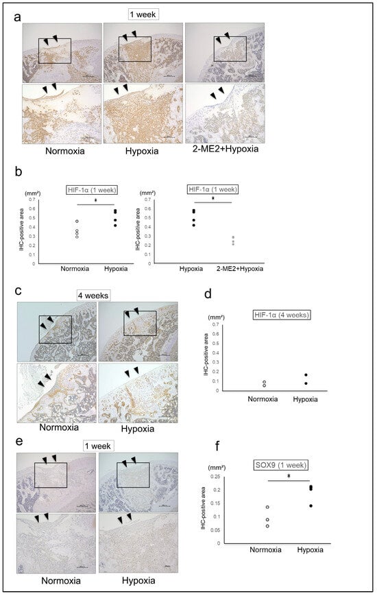 (a) HIF-1α immunostaining at 1 week postoperation, with a representative micrograph scale bar as follows: upper 500 μm, lower 200 μm. (b) HIF-1α immunostaining at 1 week postoperation (Normoxia group, n = 4; Hypoxia group, n = 4; 2-ME2 + Hypoxia group, n = 4). (c) HIF-1α immunostaining at 4 weeks postoperation, with representative micrographs (scale bar: upper 500 μm, lower 200 μm). (d) HIF-1α immunostaining at 4 weeks postoperation (Normoxia group, n = 2; Hypoxia group, n = 2). (e) SOX9 immunostaining at 1 week postoperation, with representative micrographs (scale bar: upper 500 μm, lower 200 μm). (f) SOX9 immunostaining at 1 week postoperation (Normoxia group, n = 4; Hypoxia group, n = 4). The IHC-positive area was quantified using ImageJ software (version 1.54g). The region of interest was defined as the entire osteochondral defect (▼) created in the femoral trochlear groove, and only the repair tissue within this area was analyzed. ▼: the area of the osteochondral defect. Black boxes in the 40× images indicate the regions shown at higher magnification (100×). An asterisk (*) indicates p < 0.05.