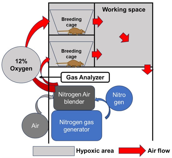 Hypoxic conditions were established using a chamber with an adjustable oxygen concentration (Natsume Seisakusho Co., Ltd., Wakenyaku Co., Ltd., Kyoto, Japan), and the equipment enabled breeding under hypoxic conditions. Nitrogen supplied from a gas generator was mixed with ambient air at a desired ratio using an air blender to reduce the oxygen concentration. This hypoxic air was circulated through the breeding cage and workplace to maintain hypoxic conditions in the chamber. The oxygen concentration in any given area of the chamber could be measured using a gas analyzer, and the oxygen concentration in the chamber could be adjusted at will within the range of 4–20% by adjusting the air blender (Figure 5). Based on previous reports of animal models, the oxygen concentration was set at 12% in the hypoxic condition [,].