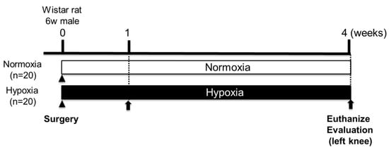 Postoperatively, rats were divided into the Normoxia group (n = 20, 21% oxygen) and the Hypoxia group (n = 20, 12% oxygen). At 1 and 4 weeks after surgery (1 week: n = 4 per group; 4 weeks: n = 16 per group), rats were anesthetized with pentobarbital, and their left femur was surgically removed (Figure 6). Both groups were bred under a 12 h light/dark cycle with free access to food and water. The body weight of both groups was measured over time until 4 weeks postoperation (n = 16).