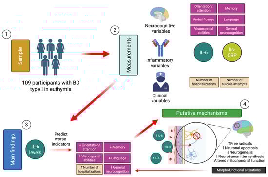 A theoretical line of research suggests a potential association between IL-6 and cognitive dysfunction in patients with BD in euthymia. This association would indicate that persistently elevated levels of IL-6 generate an inflammatory environment that structurally alters specific brain regions, with an inverse correlation between peripheral inflammatory markers and brain region volume [39,40], which is associated with cognitive deficits [36,41]. In people with BD, some of the areas most sensitive to inflammation are the anterior cingulate cortex, amygdala, prefrontal cortex, hippocampus, and orbitofrontal cortex [40], all involved in the pathophysiology of BD. At the molecular level, IL-6 can inhibit cortical neurotransmitter release through a direct action on the presynaptic neuron [42]. There is also evidence showing that multiple mood episodes alter the homeostasis between inflammatory mechanisms, oxidative processes, and neuroprotective mechanisms, resulting in cognitive alterations [36].