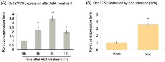 Expression of OsbZIP76 in response to ABA treatment and Xoo infection in rice seedlings. (A) qRT-PCR analysis showing temporal induction of OsbZIP76 expression following 50 μM ABA treatment. (B) OsbZIP76 expression levels 12 h after inoculation with Xoo. Expression values were normalized to a housekeeping gene and are presented relative to untreated or mock-treated controls. Bars represent mean ± standard deviation (SD) from three independent biological replicates (n = 3). (*) Asterisks indicate statistically significant differences compared to controls (* p < 0.05, ** p < 0.01).