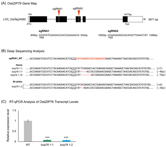 Generation and molecular validation of OsbZIP76 KO lines using CRISPR/Cas9 in rice. (A) Schematic diagram of the OsbZIP76 gene structure showing the positions of two sgRNA target sites used for CRISPR/Cas9 editing. Red triangles indicate Cas9 cleavage sites. (B) Representative mutation patterns identified by targeted deep sequencing. Orange text indicates the sgRNA sequences, while red letters represent nucleotide insertions or deletions (indels) introduced by CRISPR/Cas9 editing. (C) RT-qPCR analysis confirms the loss of OsbZIP76 transcript in KO lines. Bars represent mean ± SD from three independent biological replicates (n = 3). (*) Asterisks indicate statistically significant differences compared to WT (*** p < 0.001).