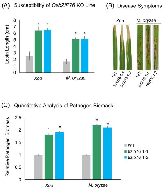 The OsbZIP76 KO lines exhibit increased susceptibility to Xoo and M. oryzae infection (A) Lesion length measurements on 4-week-old rice leaves inoculated with Xoo show significantly longer lesions in OsbZIP76 knockout (bzip76 1-1 and bzip76 1-2) lines compared to WT. Data represent mean ± SD from at least 10 leaves per line. (B) Disease symptoms and severity scores after M. oryzae infection reveal more severe blast symptoms and higher disease scores in KO lines relative to WT. (C) Quantification of bacterial and fungal biomass demonstrates increased pathogen proliferation in KO lines compared to WT plants. Bars represent mean ± SD from three independent biological replicates (n = 3). (*) Asterisks indicate statistically significant differences compared to WT (* p < 0.05).