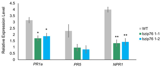 2.4. qRT-PCR Analysis of Pathogenesis-Related Gene Expression in bzip76 1-1 and bzip76 1-2 Lines