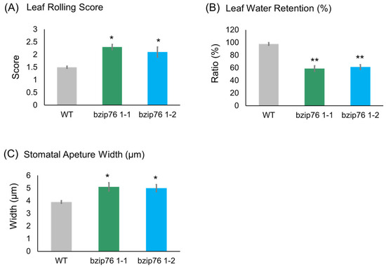 The OsbZIP76 knockout lines exhibit reduced sensitivity to ABA. (A) Leaf rolling scores after 3 h treatment with 50 μM ABA. KO lines (bzip76 1-1 and bzip76 1-2) showed significantly reduced rolling (4.5 in WT vs. 2.3 and 2.1 in KO). (B) Leaf water retention (%) following ABA treatment. WT plants retained 97.8% of their initial weight, while KO lines retained 58.7% and 61.2%, respectively. (C) Stomatal aperture widths measured after ABA exposure. KO lines exhibited impaired closure, with apertures increasing from 3.9 µm in WT to 5.1 µm and 5.0 µm (~31% increase). Bars represent mean ± SD from three independent biological replicates (n = 3). (*) Asterisks indicate statistically significant differences compared to WT (* p < 0.05, ** p < 0.01).