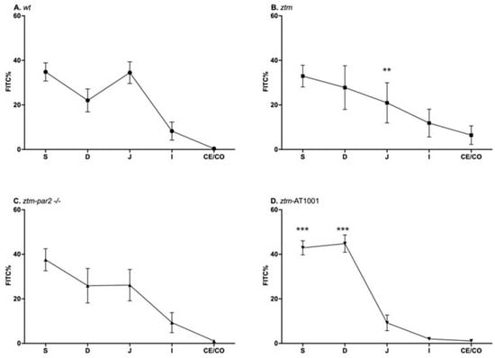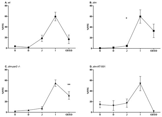 GI motility was examined by the transit of FITC-dextran, with faster transit being represented by FITC-dextran reaching segments farther in the GI tract. Under baseline conditions, (wt), ztm, ztm-par2 −/− and ztm-AT1001 mice all had a similar pattern of FITC-dextran transit, with a peak %FITC in the ileum ((wt): 59.7 ± 27% FITC, ztm: 59.8 ± 35.6% FITC, ztm-par2 −/−: 54.7 ± 20.6% FITC, ztm-AT1001: 54 ± 33% FITC) (Figure 1). ztm and ztm-par2 −/− mice also had significant differences in %FITC in the jejunum and cecum/colon, respectively, compared to (wt), (jejunum-ztm: 4.8 ± 5% versus (vs) (wt): 18.5 ± 9.8% FITC, p = 0.04; cecum/colon-ztm-par2 −/−: 31.5 ± 23.8%, (wt): 16.7 ± 26.8%, p = 0.003) (Supplementary Table S1).