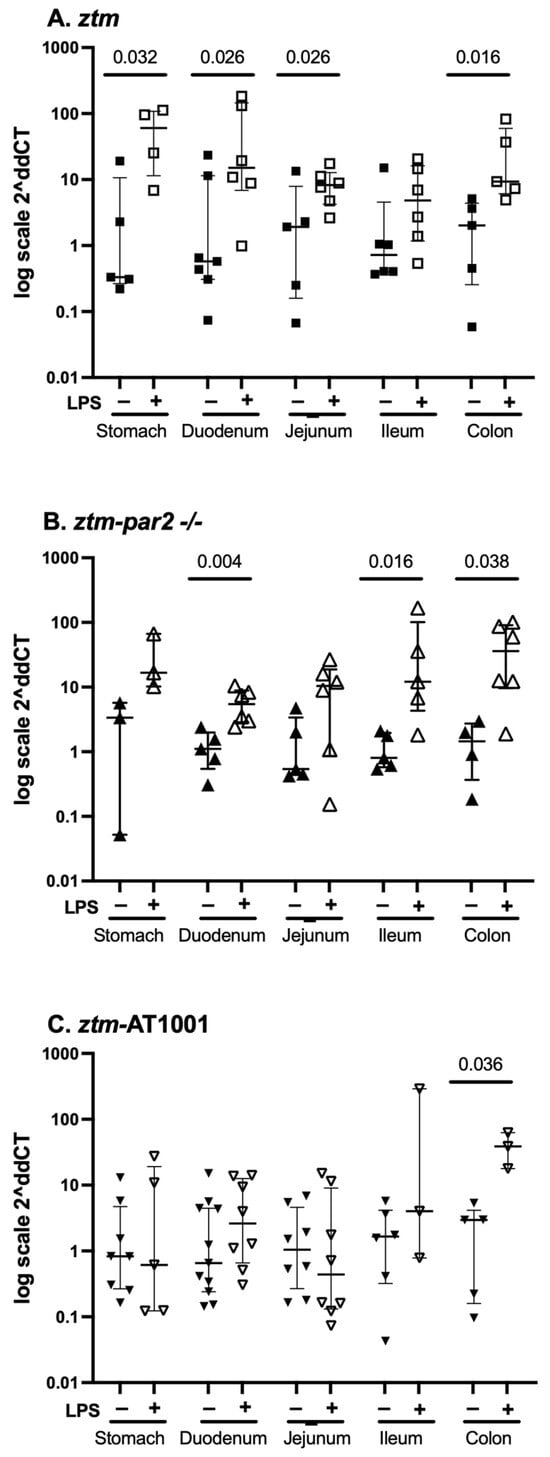 zonulin mRNA expression throughout the gastrointestinal tract. Panel (A) depicts data from PBS-(closed squares) and LPS (open squares)-injected zonulin-transgenic mice (ztm). LPS-injected ztm had more zonulin expression in the stomach, duodenum, jejunum and colon than PBS-injected ztm, p < 0.05; Panel (B) depicts data from PBS-(closed upward-facing triangles) and LPS (open upward-facing triangles)-injected protease-activated receptor 2 knockout ztm (ztm-par2 −/−) mice. LPS-injected ztm-par2 −/− had more zonulin expression in the duodenum, ileum and colon than PBS-injected ztm-par2 −/− mice, p < 0.05; Panel (C) depicts data from PBS-(closed downward-facing triangles) and LPS (open downward-facing triangles)-injected ztm exposed to AT1001 (ztm-AT1001). LPS-injected ztm-AT1001 mice had more zonulin expression in the colon than PBS-injected ztm-AT1001, p < 0.05. Data are summarized as median (25th, 75th); Kruskal–Wallis test controlled for multiple comparisons between mouse groups within each gastrointestinal tissue represented here, statistical significance set at p-value < 0.05. Data are presented as 2−ΔΔCT based on the delta cycle threshold (Ct) [dCt = target gene Ct − housekeeping gene Ct (18S)] of individual data − the mean of the PBS dCt within each mouse group.
