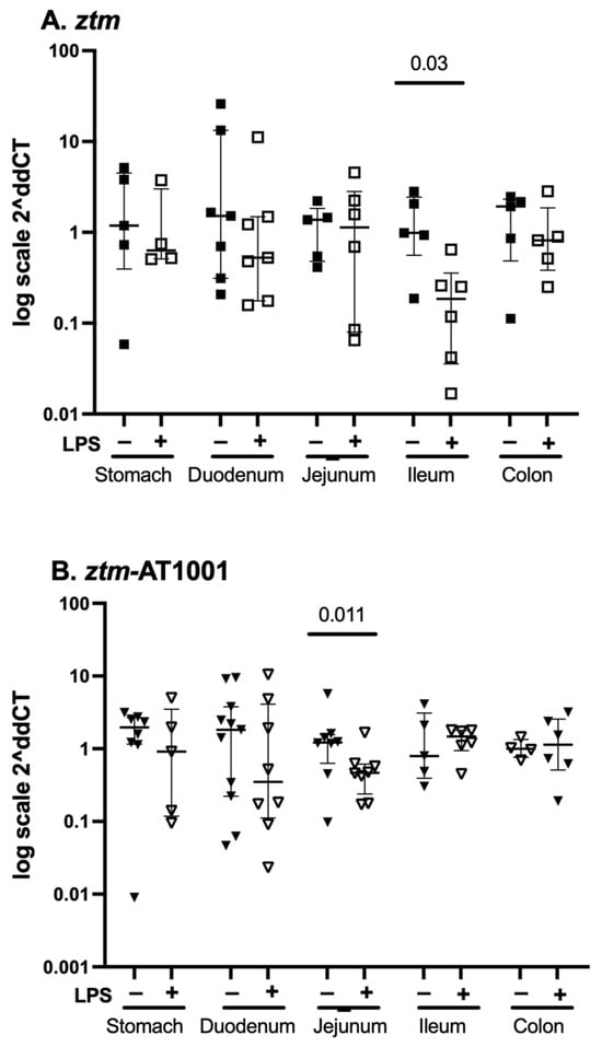 par2 mRNA expression throughout the gastrointestinal tract. Panel (A) depicts data from PBS-(closed squares) and LPS (open squares)-injected zonulin transgenic mice (ztm). LPS-injected ztm had less par2 expression in the ileum than PBS-injected ztm, p < 0.05. Panel (B) depicts data from PBS-(closed downward-facing triangles) and LPS (open downward-facing triangles)-injected, ztm exposed to AT1001 (ztm-AT1001). LPS-injected ztm-AT1001 had less par2 expression in the jejunum than PBS-injected ztm-AT1001, p < 0.05. Data are summarized as median (25th, 75th); Mann–Whitney U test between mouse groups within gastrointestinal tissue. Data are presented as 2−ΔΔCT based on the delta cycle threshold (Ct) [dCt = target gene Ct − housekeeping gene Ct (18S)] of individual data − the mean of the PBS dCt within each mouse group.
