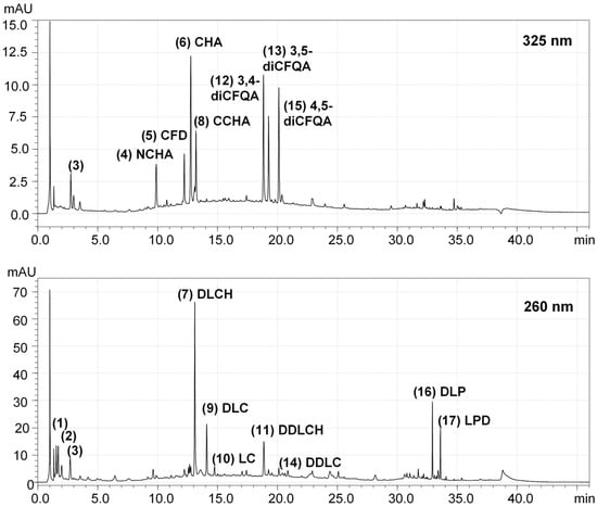 Representative UHPLC-PDA chromatograms at 325 nm and 260 nm of the chicory root extract obtained using pressure-assisted extraction (2nd method). The numbering of the compounds (1–17) corresponds to that in Table 1. Abbreviations: 3,4-diCFQA, 3,5-dicaffeoyl quinic acid; 3,5-diCFQA, 3,5-dicaffeoyl quinic acid; 4,5-diCFQA, 4,5-dicaffeoyl quinic acid; CCHA, cryptochlorogenic acid; CFD, caffeic acid derivative; CHA, chlorogenic acid; DDLC, 11(S),13-dihydro-8-deoxylactucin; DDLCH, 11(S),13-dihydro-8-deoxylactucin hexoside; DLC, 11(S),13-dihydrolactucin; DLCH, 11(S),13-dihydrolactucin hexoside; DLP, 11(S),13-dihydrolactucopicrin; LC, lactucin; LPD, lactucopicrin derivative; NCHA, neochlorogenic acid.