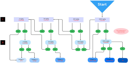 Classification scheme of acute oral toxicity tests applied for the chicory root extract following the OECD guideline [26,50]. “I” and “II” refer to the first and second stages of administration of the substance in accordance with OECD recommendations for toxicity studies. Due to no moribund or dead animals observed, the extract was tested at the dose of 2000 mg/kg bw only. The diagram was developed using the Canva software (Canva, Inc., Sydney, Australia; https://www.canva.com/ (accessed on 5 March 2025)).
