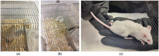 After dosing, each animal was placed in a separate cage (Figure 4) and observed at regular intervals: 30 min after administration, then hourly for 4 h, and subsequently once a day for the next 14 days. Observations included the condition of the skin, coat, eyes, mucous membranes, respiratory system, autonomic and nervous systems, somatomotor activity, and response to stimuli.
