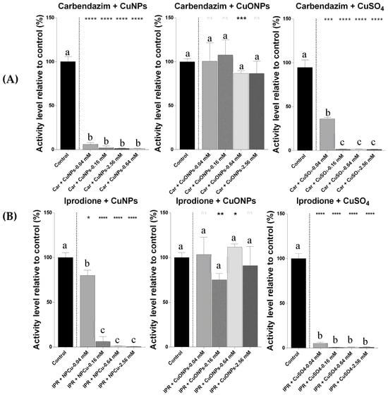 Metabolic activity of nitrobacter winogradskyi after 8 days of exposure to the combined treatments with fungicides and copper-based compounds. (A) Carbendazim combined with copper nanoparticles (CuNPs), copper oxide nanoparticles (CuONPs), and copper sulfate (CuSO4). (B) Iprodione combined with copper nanoparticles (CuNPs), copper oxide nanoparticles (CuONPs), and copper sulfate (CuSO4). The bars represent the mean values ± SDs from the triplicate assays. The different lowercase letters (a, b, c) indicate the statistically significant differences among the treatments, according to the one-way ANOVA and Tukey’s post hoc test (p < 0.05). The asterisks indicate the statistically significant differences compared to the control, based on paired Student’s t-tests (* p < 0.05; ** p < 0.01; *** p < 0.001; **** p < 0.0001; ns: not significant difference).