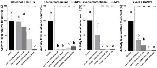 Metabolic activity of N. winogradskyi after 8 days of exposure to combinations of the pesticide derivative compounds (catechol, 3,5-dichloroaniline, and 2,4-dichlorophenol), herbicide 2,4-D, and copper nanoparticles (CuNPs) at various concentrations. The bars represent the means ± SDs from the triplicate assays. The different lowercase letters (a, b, c) above the bars denote the statistically significant differences among the treatments, as determined by one-way ANOVA followed by a Tukey’s post hoc test (p < 0.05). The asterisks indicate the statistically significant differences compared to the control, based on paired Student’s t-tests (* p < 0.05; ** p < 0.01; and *** p < 0.001).