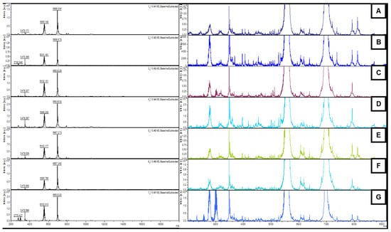 The protein profiles of N. winogradskyi obtained by MALDI-TOF MS/MS generated by exposure to the treatments. Left: main profiles. Right: details of the sub-represented peaks. (A) control, (B) the CuNPs, (C) carbendazim, (D) iprodione, (E) the CuONPs, (F) iprodione + CuNPs, and (G) carbendazim + CuNPs.