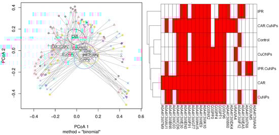 The heatmap represents the predicted proteins found for each treatment (Figure 7, right), and the dendrogram represents the similarities between the treatments with the same entries. The molecular weights of the analytes were queried in the database, revealing peptide sequences with lengths ranging from 40 to 65 amino acid residues. Nonetheless, the N. winogradskyi database on UNIPROT showed that most proteins were not characterized. The cluster analysis is represented by a dendrogram (based on the Euclidean distance) on the left side of the heatmap. It suggested that the control and CuONPs had the most similar expression patterns, while the patterns for the iprodione and carbendazim treatments were more dissimilar than those of the control.