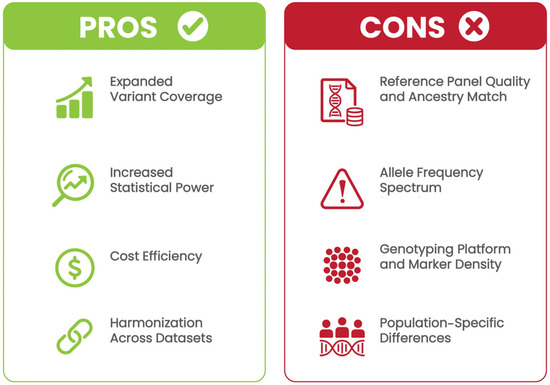 Figure 1. Pros and cons of genotype imputation in clinical GWAS applications. Benefits include expanded variant coverage, improved statistical power, cost efficiency, and harmonization across datasets. Limitations include dependency on reference panel quality, allele frequency spectrum biases, genotyping platform variability, and population-specific imputation challenges.