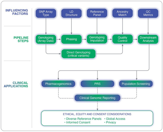 Figure 2. Overview of the genotype imputation pipeline in genome-wide association studies. The diagram illustrates key analytical steps (e.g., genotyping, phasing, imputation, and quality control), upstream influencing factors (e.g., LD structure, SNP array type, and reference panel quality), and clinical applications such as pharmacogenomics, polygenic risk scoring (PRS), and population screening. Ethical and equity considerations are also highlighted, including the importance of diverse reference panels, informed consent, and privacy.