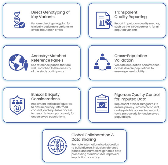 Figure 3. Best practices for clinical implementation of GWASs and genotype imputation. This framework outlines seven core recommendations: direct genotyping of clinically actionable variants, transparent reporting of imputation quality metrics, cross-population validation, ancestry-matched reference panels, rigorous quality control, ethical and equity safeguards, and global collaboration. Together, these practices promote accurate, inclusive, and responsible integration of genomic data into healthcare.