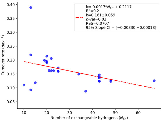 The NEH dependence of the turnover rates is demonstrated in the example of the turnover rates of the peptides of the murine liver CH60 protein (60 kDa heat shock protein, mitochondrial). This protein is one of the abundant proteins in the liver. Its label enrichment and turnover rate are quantified by 51 peptides. The distribution of the turnover rates of CH60 peptides as a function of their NEH values is shown in Figure 2. As seen from the figure, the turnover rates of the peptides of the same protein are dependent on the NEH values. The slope of the linear regression was statistically significant (p = 0.0305). This empirical observation agrees with the analyses following Equation (6) for the proportion of the unlabeled species relative to the plateau of labeling. Thus, the theoretically calculated relative proportion of unlabeled peptides (at the protein half-life) for NEH = 15 was 43%, while the respective value for NEH = 25 was 38%. The observation for the CH60 protein generalizes to the whole liver proteome, which is demonstrated in Figure S1. The turnover rates are the derivative parameters—these are obtained from the modeling of the time course of the monoisotopic RA. The monoisotopic RA of a peptide is expected to depend on the peptides’ NEH value, as can be seen from Equation (3). However, the enrichment in deuterium, pX(t), can be viewed as a property of a protein and only dependent on the protein turnover rate, labeling duration, and body water enrichment, pW. Therefore, pX(t) as computed by Equation (5) could be thought of as independent of NEH and as the same for all peptides of a protein at any given duration of labeling.